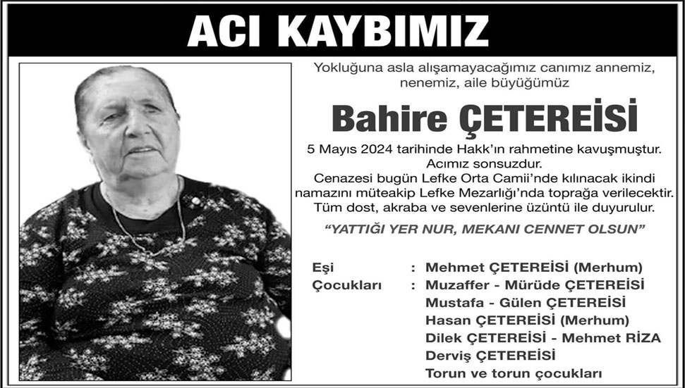 Bahire Çetereisi’nin cenazesi bugün saat 16.30’da Lefke Orta Camii’nde kılınacak ikindi namazının ardından Lefke Mezarlığı’na defnedilecek.