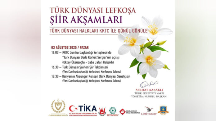 Türk Edebiyatı Vakfının, Türk Dünyası’nın kültürel bağlarını güçlendirmek ve ortak edebi mirası yaşatmak amacıyla düzenlediği “Türk Dünyası Lefkoşa Şiir Akşamları”, bu yıl 1-3 Ağustos 2025 tarihleri arasında Kuzey Kıbrıs Türk Cumhuriyeti’nde gerçekleştiriliyor.