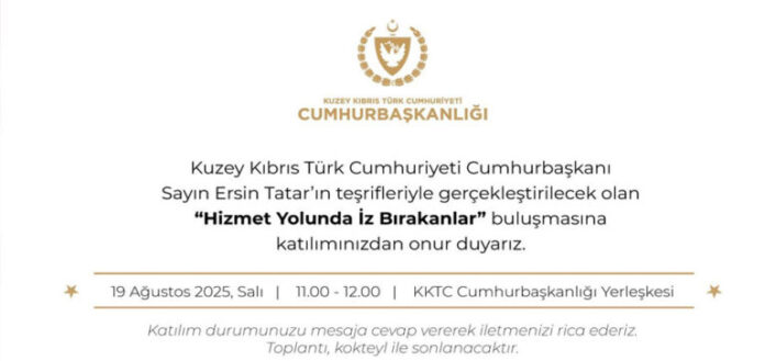 Cumhurbaşkanlığı’ndan yapılan açıklamaya göre, Cumhurbaşkanlığı Yerleşkesi’nde 11.00-12.00 saatleri arasında Cumhurbaşkanı Ersin Tatar’ın katılımıyla tüm emekli bürokrat ve müşavirlerin davet edildiği “Hizmet Yolunda İz Bırakanlar Buluşması” gerçekleştirilecek.”