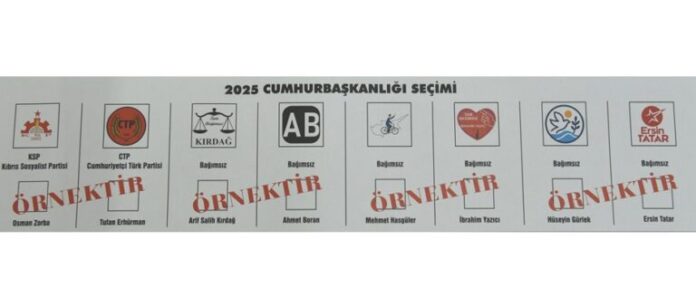 “Osman Zorba (Kıbrıs Sosyalist Partisi) 1, Tufan Erhürman (Cumhuriyetçi Türk Partisi) 2, Arif Salih Kırdağ (Bağımsız) 3, Ahmet Boran (Bağımsız) 4, Mehmet Hasgüler (Bağımsız) 5, İbrahim Yazıcı (Bağımsız) 6, Hüseyin Gürlek (Bağımsız) 7, Ersin Tatar (Bağımsız) 8.”