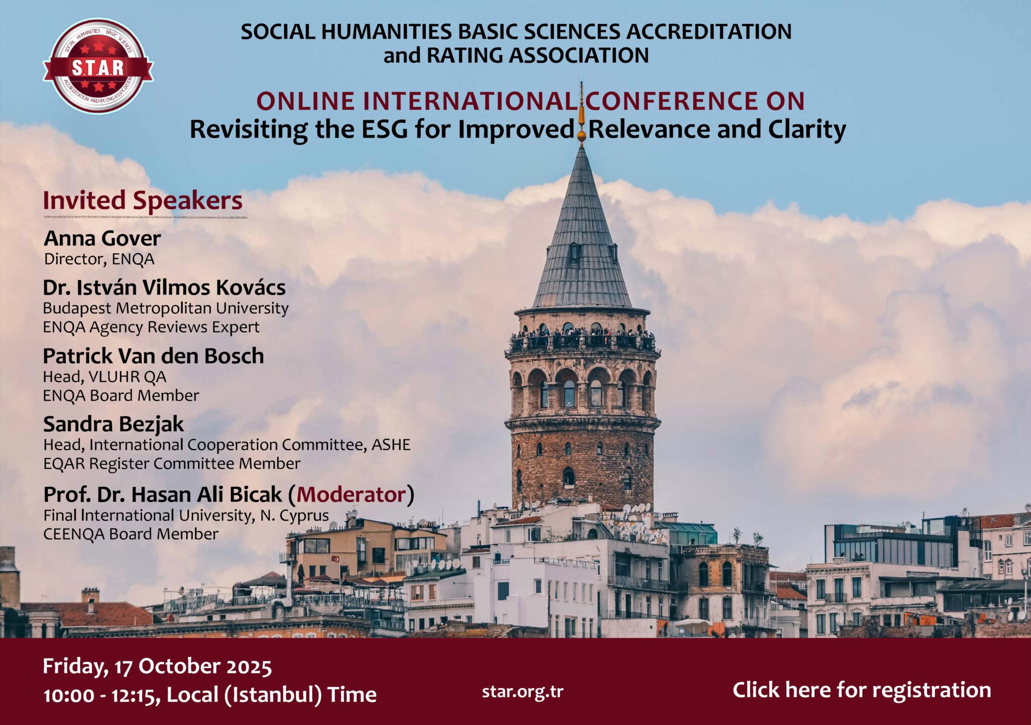 STAR’dan yapılan açıklamaya göre, çevrim içi olarak düzenlenecek konferans saat 10.00’da başlayacak. Konferansın teması, Avrupa Yükseköğretim Alanı Kalite Güvencesi Standartları ve Rehberi çerçevesinde “Revisiting the ESG for Improved Relevance and Clarity” (Daha İlgili ve Açık ESG için Yeniden Değerlendirme) olarak belirlendi. Konferans, Avrupa yükseköğretim alanında kalite güvencesi uygulamalarının geleceğine yön verecek tartışmalara ev sahipliği yapacak.