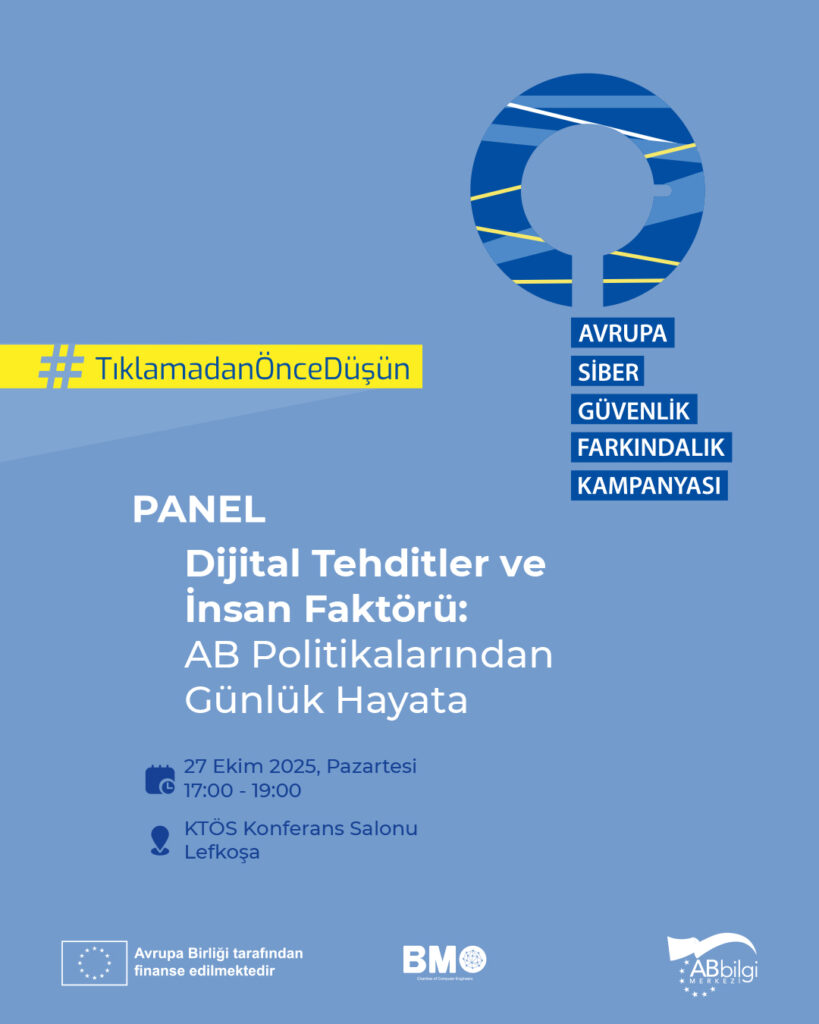 Avrupa Birliği (AB) Bilgi Merkezi, Avrupa Siber Güvenlik Farkındalık Ayı kapsamında Kıbrıs Türk Bilgisayar Mühendisleri Odası iş birliğiyle, “Dijital Tehditler ve İnsan Faktörü: AB Politikalarından Günlük Hayata” başlıklı panel düzenleyecek.