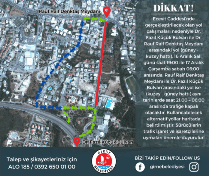 Girne Belediyesi, Ecevit Caddesi’nde yapılacak yol çalışmaları nedeniyle bazı güzergâhların bu akşam belirli saatlerde trafiğe kapatılacağını duyurdu.