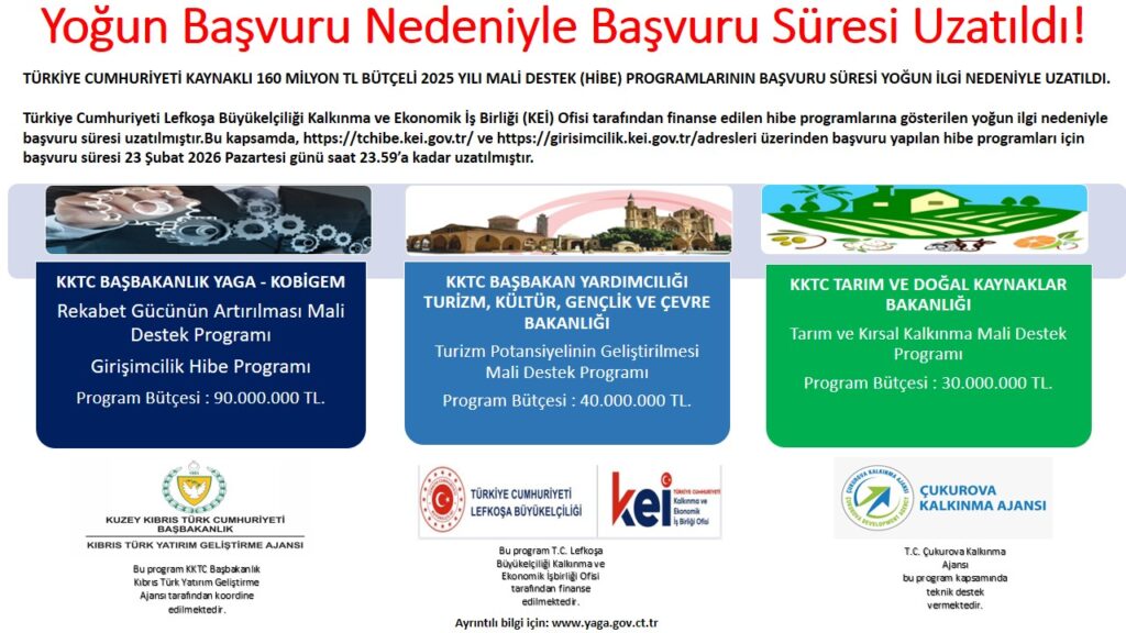 Türkiye Cumhuriyeti Lefkoşa Büyükelçiliği Kalkınma ve Ekonomik İş Birliği (KEİ) Ofisi tarafından finanse edilen hibe programlarına gösterilen yoğun ilgi nedeniyle başvuru süresi uzatılmıştır.