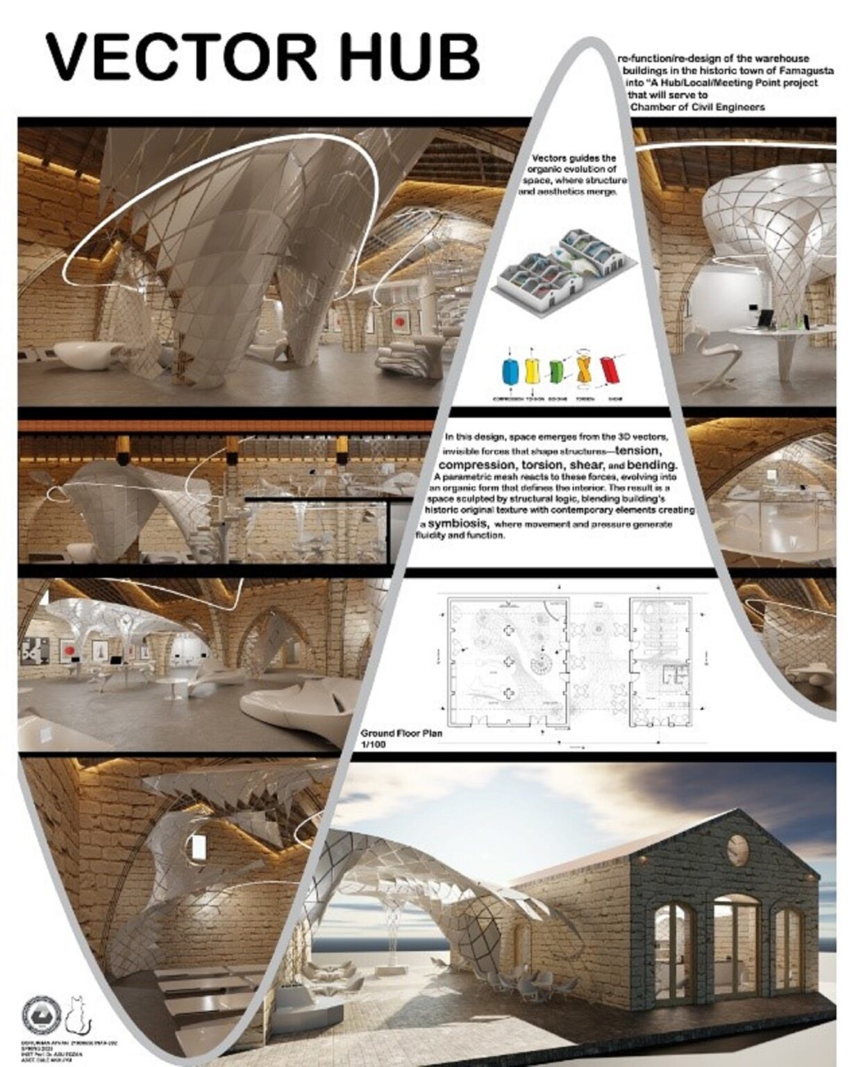 Ayhan’ın Prof. Dr. Asu Tozan danışmanlığında hazırladığı “Vector Hub” adlı projesi ise Mağusa’daki tarihi depo yapılarının yeniden işlevlendirilmesini ele alarak “En İyi Öğrenci Restorasyon veya Rekonstrüksiyon Projesi” kategorisinde Platinum Ödülü kazandı.