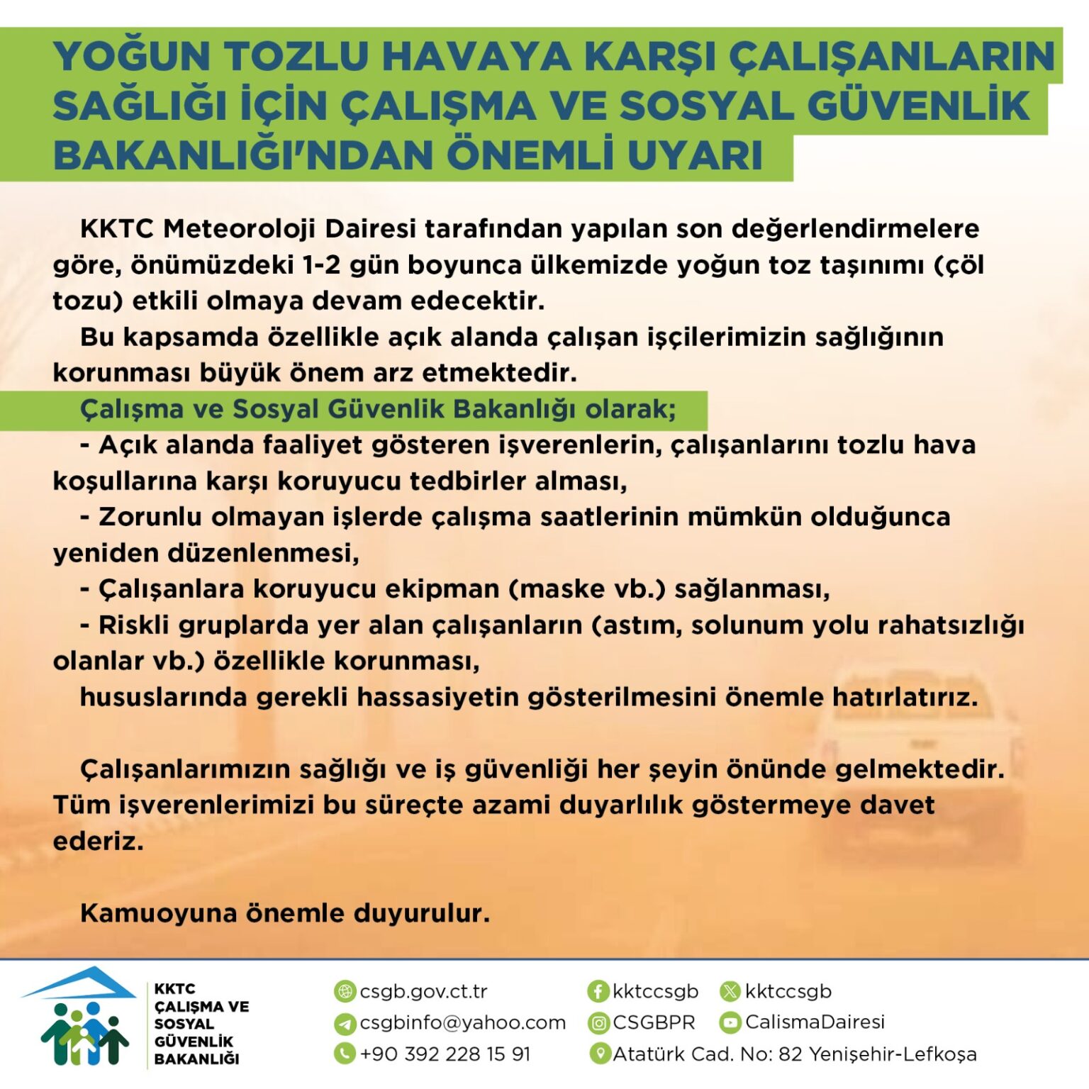 “Bakanlık olarak, açık alanda faaliyet gösteren işverenlerin; çalışanlarını tozlu hava koşullarına karşı koruyucu tedbirler alması, zorunlu olmayan işlerde çalışma saatlerinin mümkün olduğunca yeniden düzenlenmesi, çalışanlara koruyucu ekipman (maske vb.) sağlanması, riskli gruplarda yer alan çalışanların (astım, solunum yolu rahatsızlığı olanlar vb.) özellikle korunması hususlarında gerekli hassasiyetin gösterilmesini hatırlatırız.”